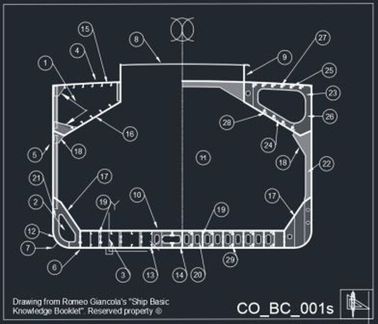 Disegno della sezione trasversale di una bulkcarrier a singolo scafo.